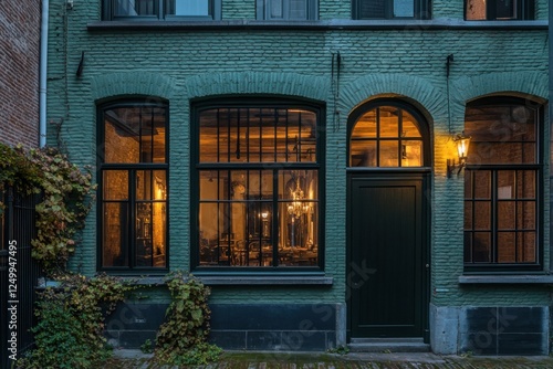 Experience the captivating blend of modern architectural allure set against a cozy urban backdrop, where the warm glow of lighting enhances the inviting dining area during the tranquil dusk hours