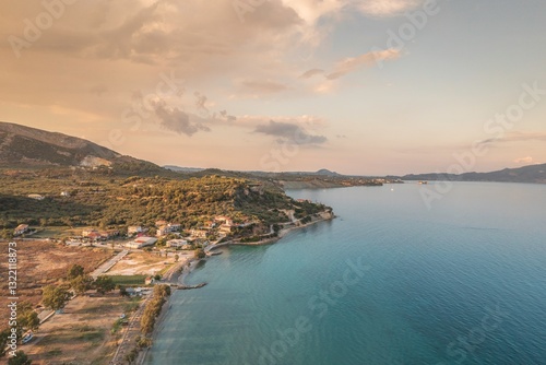 Experience the enchanting beauty of Zakynthos, where serene turquoise waters meet dramatic white cliffs. Sunset casts a golden glow over this idyllic landscape, showcasing the island's natural charm