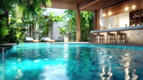 Experience the luxury ambiance of an elegant swim-up bar gracefully integrated into a stunning resort swimming pool, where relaxation and indulgence meet under the sun.