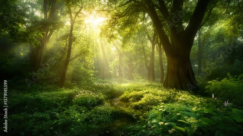 Experience the Magic of a Serene Forest Scene at Dawn as Nature Awakens in a Breathtaking Symphony of Colors and Sounds