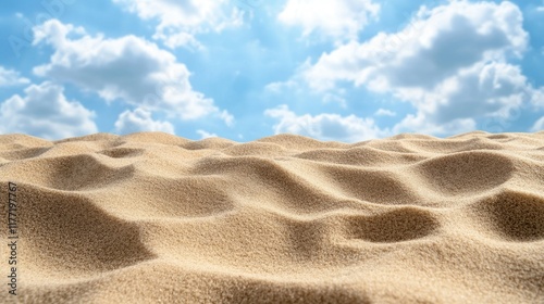 Experience the serene beauty of a sandy beach under a bright blue sky with fluffy white clouds in Hanoi, Vietnam.