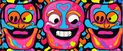 Experience the whimsical fun of vibrant psychedelic patterns with colorful cartoon faces melting with smiles. This retro style design exudes fun charm with its unique design. Generative AI