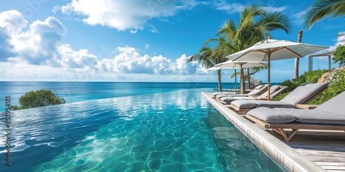 Experience ultimate relaxation at a tropical resort, lounging by the poolside oasis overlooking the sea.