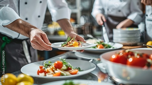 Experienced Chefs Engage in Culinary Competition Plating Dishes with Precision for Judges Critique
