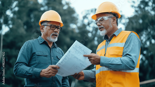Experienced construction workers review blueprints on site, showcasing teamwork and expertise in their field. Their hard hats and safety vests emphasize importance of safety in construction