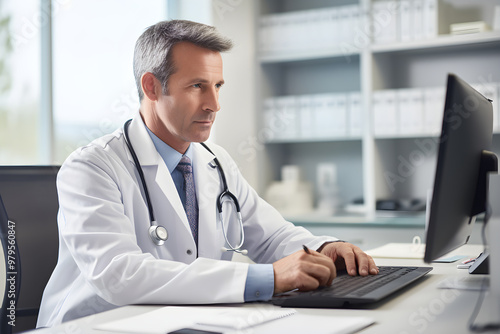 Experienced Healthcare Professional Engrossed in Patient Reports in his Medical Office