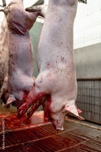 Experienced middle age man working in fresh meat processing plant. Industrial slaughterhouse worker job. Food industry business concept.