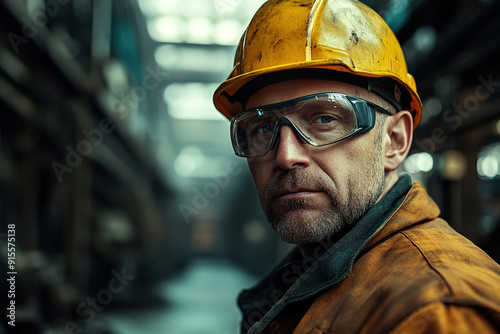 Experienced middle-aged factory worker in a steel plant wearing a yellow helmet and safety glasses, standing confidently with an industrial backdrop. Highlights safety and professionalism in a manufac