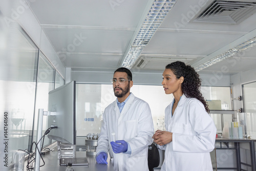Experienced scientists colorating in oratory