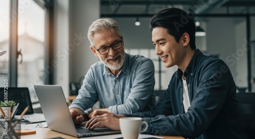 Experienced senior businessman mentoring a young female colleague, working together on a laptop in a modern office.