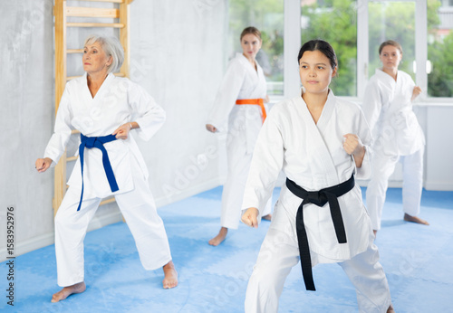 Experienced skilled young female karate sensei wearing white kimono adorned with black belt to prove mastery of martial arts techniques, leading group of women during kata training