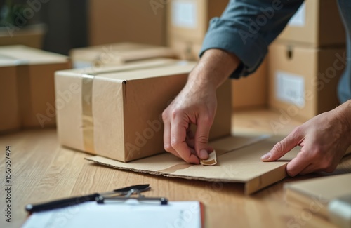 Expert hands carefully seal cardboard parcel with tape. Multiple stacked boxes ready for shipment and delivery. Focus on e-commerce logistics, online shopping, and distribution preparation.