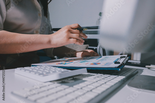 Expert woman asian female people review data number costing managerial account prepare monthly actual cost variance report at tax audit office. ESG sheet budget control ERP process service project.