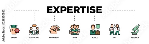 Expertise infographic icons flow process which consists of expert, consulting, knowledge, team, advice, trust, and research icon live stroke and easy to edit .