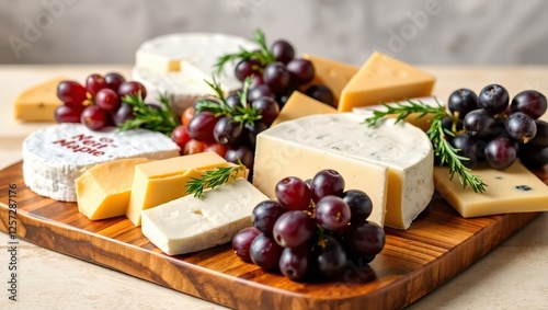 Expertly arranged gourmet cheese platter, featuring an assortment of artisanal cheeses, such as brie, cheddar, and gouda, artfully paired with succulent purple grapes and fresh fragrant herbs.