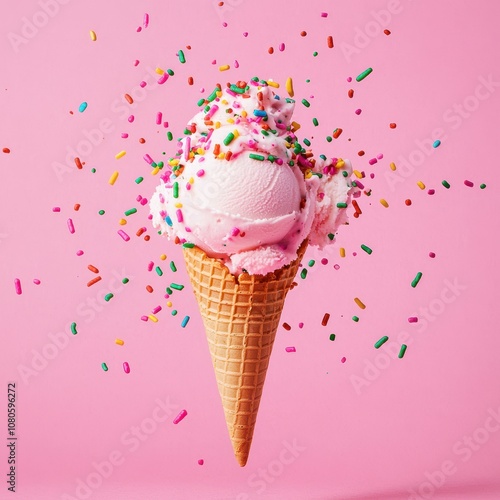 Exploded ice cream cone with scoops, sprinkles, and a cone flying apart in a playful and colorful display, [Food exploded], [fun dessert imagery] ,closes up