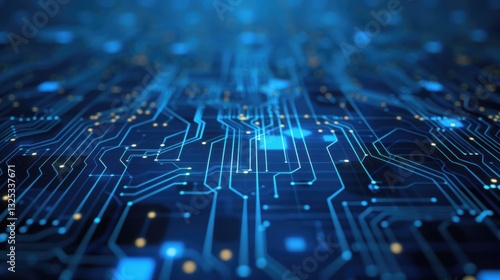 Exploration of digital circuits in a vivid blue landscape with 3D technology elements