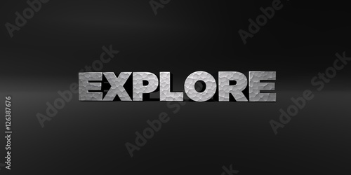 EXPLORE - hammered metal finish text on black studio - 3D rendered royalty free stock photo. This image can be used for an online website banner ad or a print postcard.