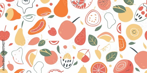 Explore a harmonious geometric floral pattern of organic fruits and plants in a simplified eco-inspired design for a modern aesthetic