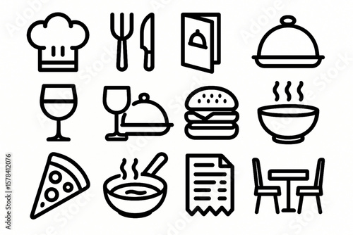 Explore a stylish set of restaurant icons featuring chef hat, menu, and pizza symbols. Perfect for food apps, dining websites, and culinary designs. High-quality vector art with a minimalist, elegant