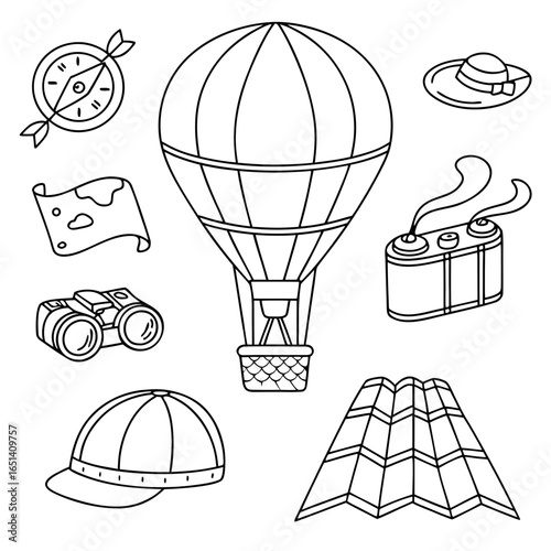 Explore adventure travel with hot air balloon compass map and binoculars vacation planning outline drawing vector