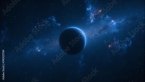 Explore an enigmatic dark planet with ethereal blues drifting in a starlit void amidst radiant glowing nebula clouds