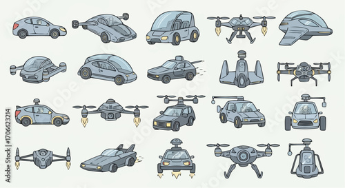 Explore innovative flying car designs and future transportation concepts in this vehicle illustration set vector