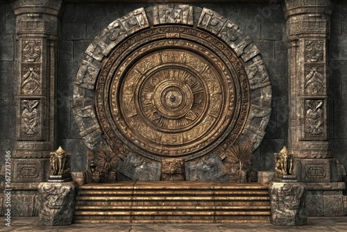 Explore old ruins with stone circle, columns and stairs, ancient culture Theme.