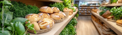 Explore the Charm of an Eco-Friendly Vegan Grocery and Bakery, showcasing Wooden Shelves Stocked with Bread, Buns, and Snacks Discover a sustainable shopping experience filled with fresh, plant-based