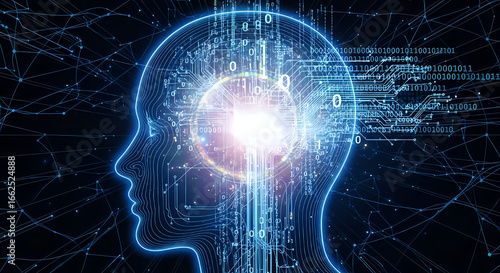 Explore the future of human intelligence with glowing digital circuits and binary code forming a futuristic human head outline