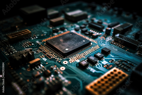 Explore the intricate details of a computer motherboard, emphasizing the advanced technology embedded in its microchip. Ai generated