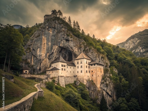 Explore the Majestic Predjama Castle: A Stunning Vintage Perspective of Slovenia's Medieval Marvel Carved into Rock Amidst Breathtaking Natural Scenery