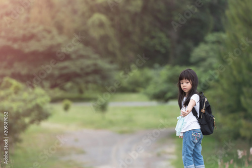 explorer kid girl walking with backpack hiking