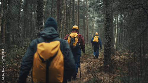 Explorers venture through a misty forest trail, embracing the calm of nature and adventure together
