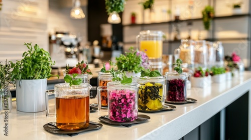Exploring a colorful healthy tea display at a modern beverage showcase in a bright inviting ambiance