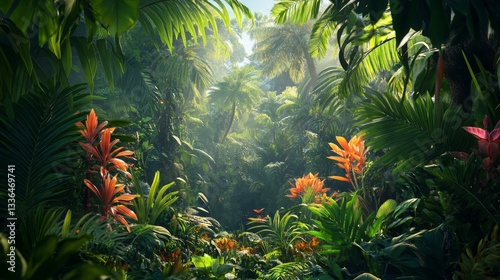 Exploring a lush jungle scene tropical rainforest gigapixel artwork vibrant environment wide-angle view artistic rendering