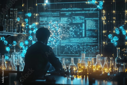 Exploring chemistry innovations digital rendering of a chemical formula in a high-tech laboratory environment captured from the perspective of a researcher engaged in discovery