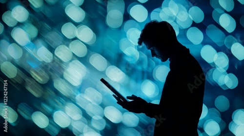 Exploring Digital Realms: A Modern Silhouette with a Tablet Amidst Bokeh Lights