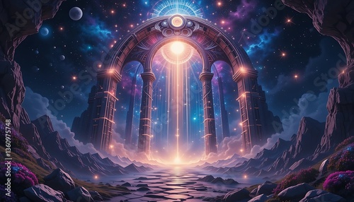 Exploring Gateway Archway to Celestial Realm with Stars and Mountain Landscape