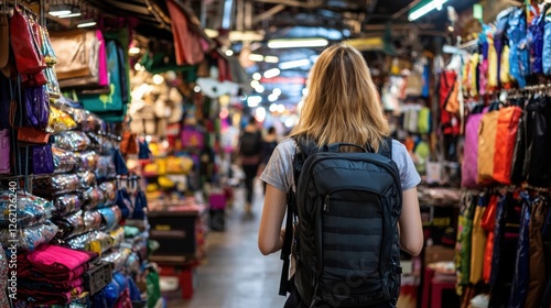 Exploring local markets vibrant streets shopping adventure urban environment back view cultural experience