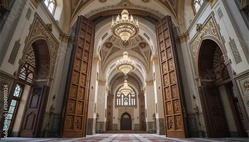 Exploring Ornate Mosque Interior with Chandeliers and Arched Doorways
