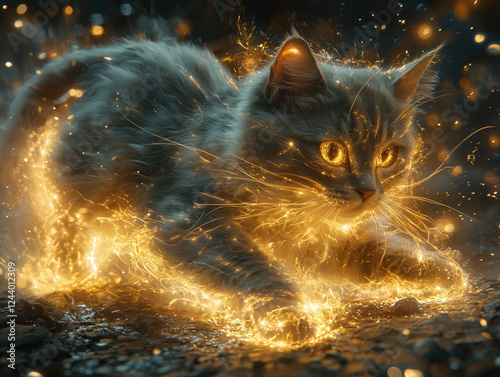 Exploring Schrödinger's cat paradox through a glowing feline existing in quantum superposition within a vibrant energy field