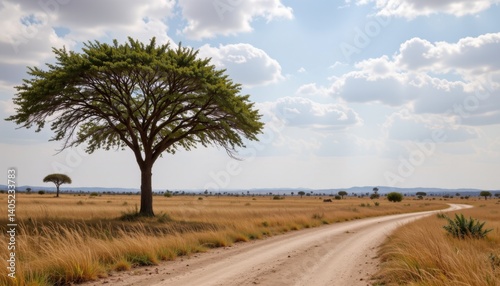 Exploring the serenity of a dusty road african savanna landscape photography sunny day wide-angle view nature's beauty