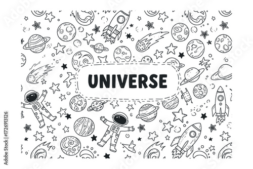 Exploring the universe space adventure outer space cosmic environment playful viewpoint imaginative concept. Vector illustration