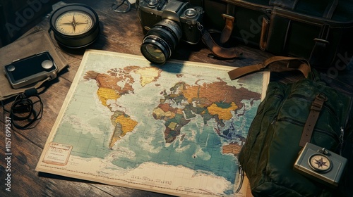 Exploring the world travel gear and map setup indoor workspace travel photography adventure planning