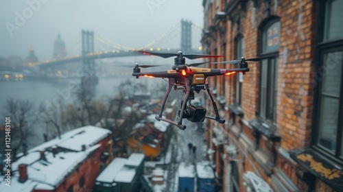 Exploring urban landscapes with a drone capturing a winter skyline at dusk. Generative AI
