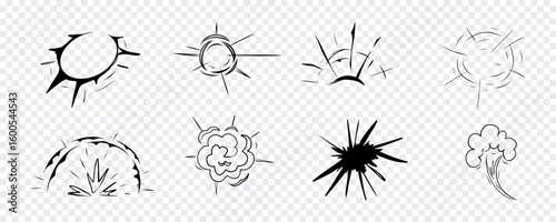 Explosion effect comic manga line sketch. Motion anime explode, radial action burst. Round explosions cloud silhouette on transparent background.