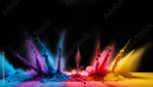 Explosion of colored powder on black background, color powder, powder explosion, colored dust, vibrant colors, powder burst, colorful explosion.