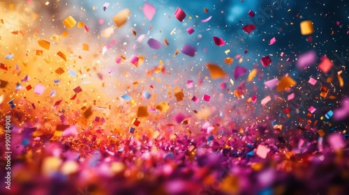 explosion of colorful confetti against vibrant backdrop flying paper pieces catch light creating depth and movement joyful celebratory mood perfect for festivals or new years eve