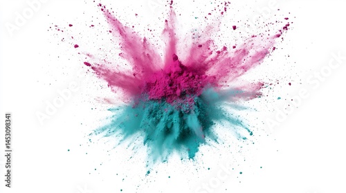 Explosion of fuchsia teal powder pigment in mid air freeze moment isolated on white background vivid hue contrast clean composition crisp fine particles no shadow